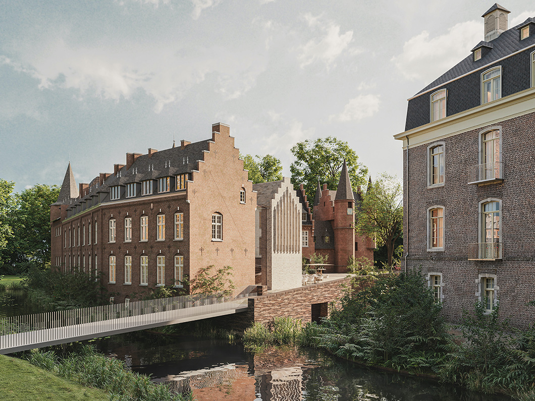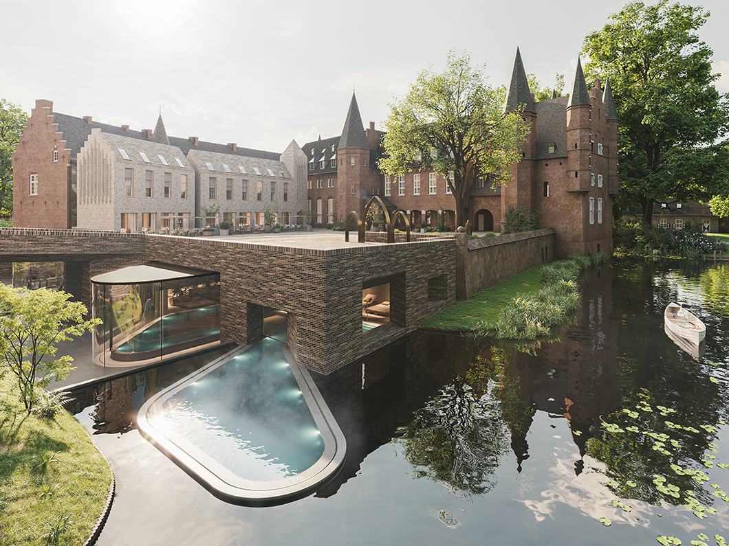 We have been commissioned to design the entire interior of the first Curio Collection by Hilton hotel in The Netherlands. The hotel is set in a 14th-century castle named ‘Kasteel Gemert Eindhoven’, which will undergo a major renovation to transform it into a five-star ‘high-end domain of fascination’ for both business and leisure. Our team of designers will shape all 56 guestrooms, 2 restaurants, a bar, an indoor meeting room, a large outdoor event space, as well as the spa and wellness spaces, including an indoor swimming pool. The architecture of the castle extension was designed by VIP architecten.